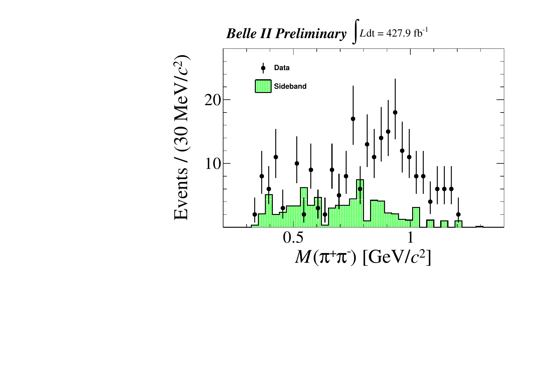 The distribution of $M(\pi^+\pi^-)$ in the $Y(4230/4320)$ signal region. The black dots with error bars represent the selected data and the green shaded histograms are the normalized $J/\psi$ sidebands.